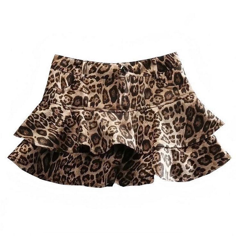 Sentetik kumaştan yapılmış, kahverengi leopar desenli ve fırfırlı, dar kesim mini etek. Cesur Paris sokak modasını yansıtır, dış mekan kullanımı için uygundur.