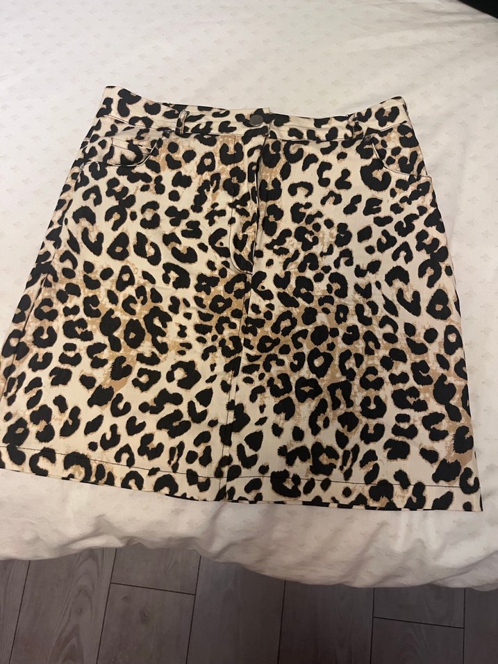 Kahverengi leopar desenli, dar kesim mini etek. Cesur sokak stili için uygun, dış mekan kullanımı için ideal.