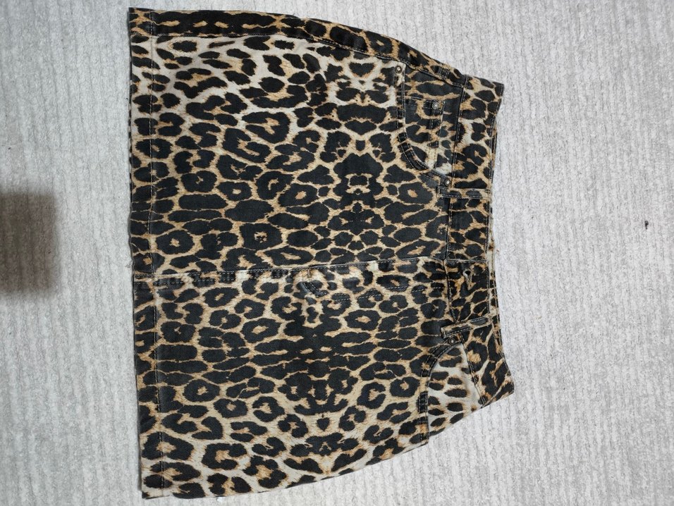 Kahverengi leopar desenli, kürk detaylı, vücuda oturan mini etek. Bohem ve sokak modası için uygun, dış mekan kullanımı için ideal.
