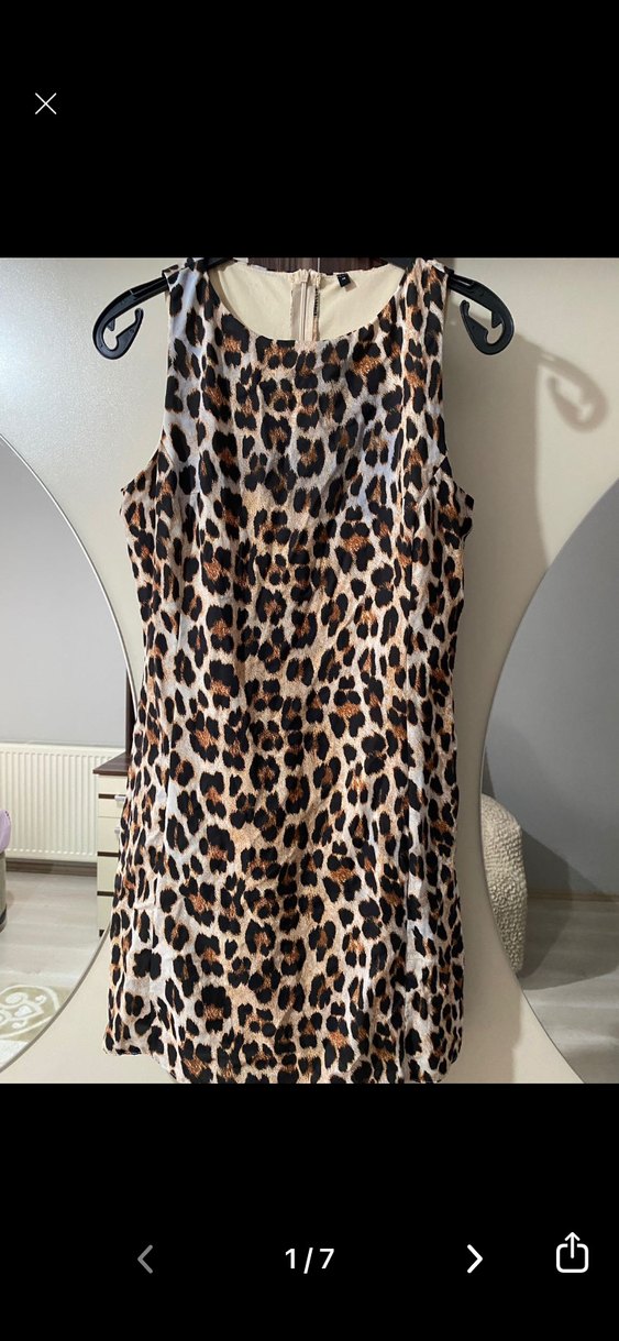 Yüksek yakalı, kolsuz, leopar desenli, sentetik kumaştan yapılmış, kürk detaylı ve vücuda oturan mini elbise. (YANLIŞLIKLA SİYAHLARIN ARASINA KARIŞTI ÜST KISIMLARI LEKE OLDU UYGUN SATIYORUM )