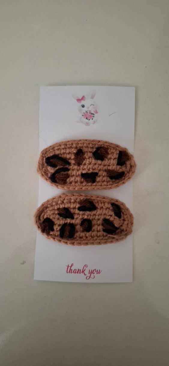 Kahverengi örgü, koyu leopar desenli çocuk saç tokaları. Bohem ve retro tarzda, üzerinde 'thank you' yazılı kartla iki adet toka seti.