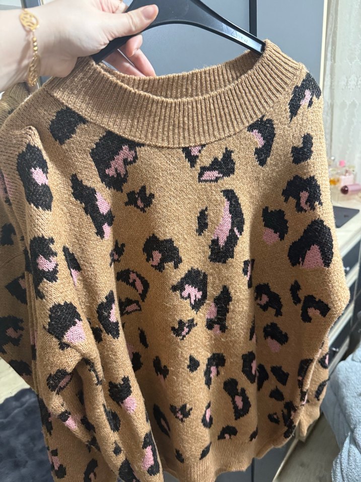 Kahverengi, leopar desenli örme kazak, uzun kollu ve bisiklet yakalıdır. Salaş kesimi ve normal boyu ile trend sokak stiline uygundur.
