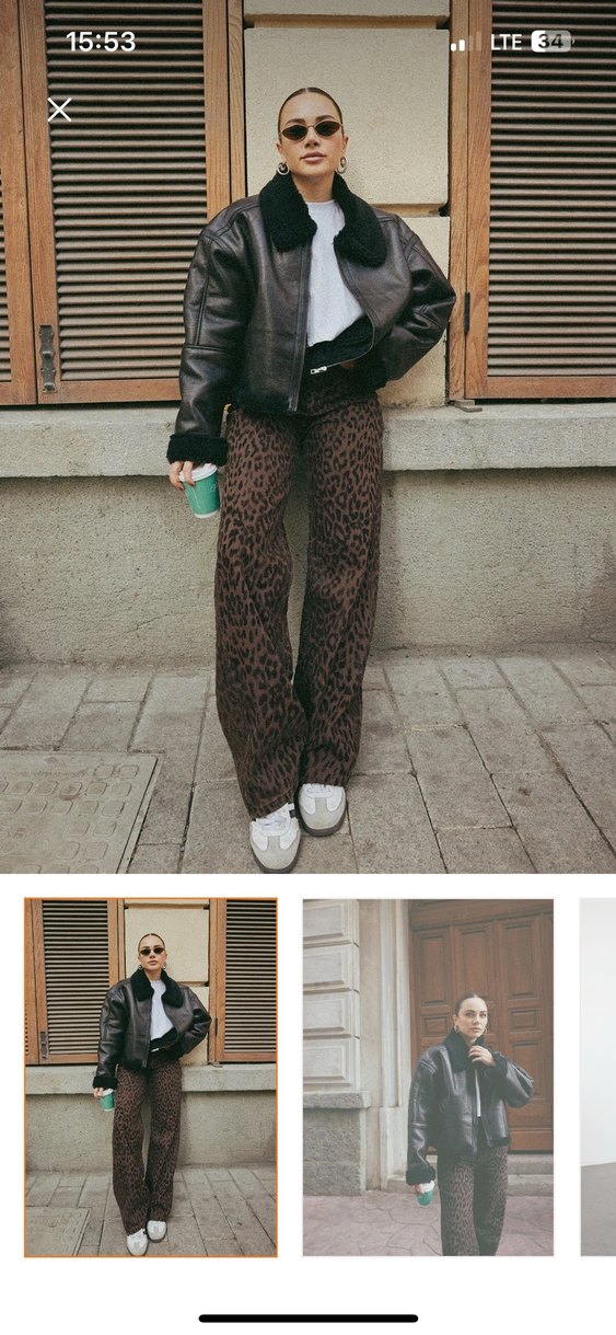 Koyu leopar desenli kahverengi deri, bol kesim pantolon, kürk detaylı, trend sokak stili için uygun.