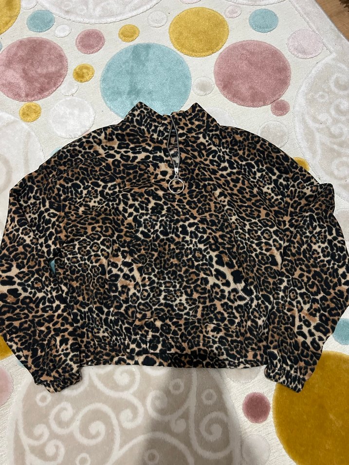 Kadın ceketi, bol kesim, uzun kollu ve boğazlıdır. Yumuşak ve sıcak kumaştan yapılmış, koyu kahverengi leopar desenli ve midi boydadır.