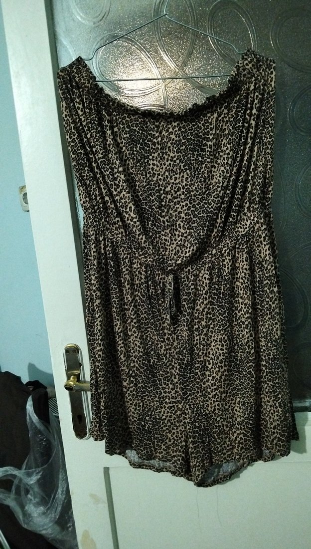 Askısız, dökümlü ve salaş kesimli bu tulum yumuşak sentetik kumaştan üretilmiştir. Koyu kahverengi yılan deseniyle gündelik, bohem tarz sunar. birkaç delik vardı lastik yakınında dikildi