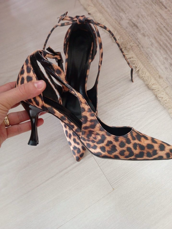 Kahverengi leopar desenli, kürk detaylı, bağcıklı stiletto topuklu ayakkabı, sentetik kumaştan, sokak modasına uygun.