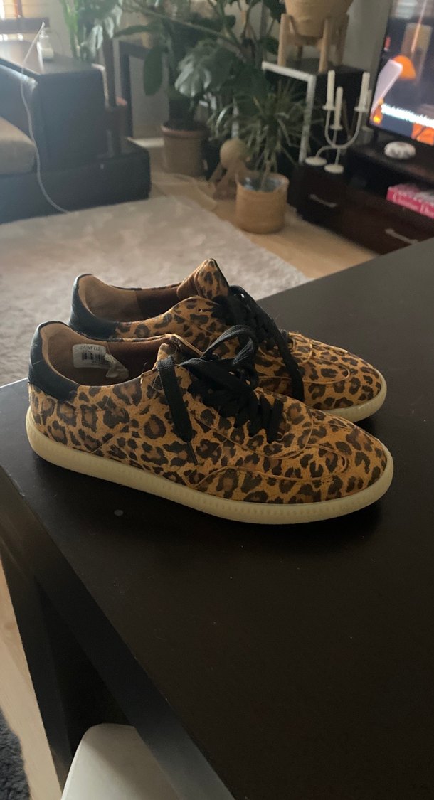 Leopar desenli kahverengi süet spor ayakkabı, kürklü detaylı ve platform topuklu. Günlük kullanıma uygun rahat bir model.