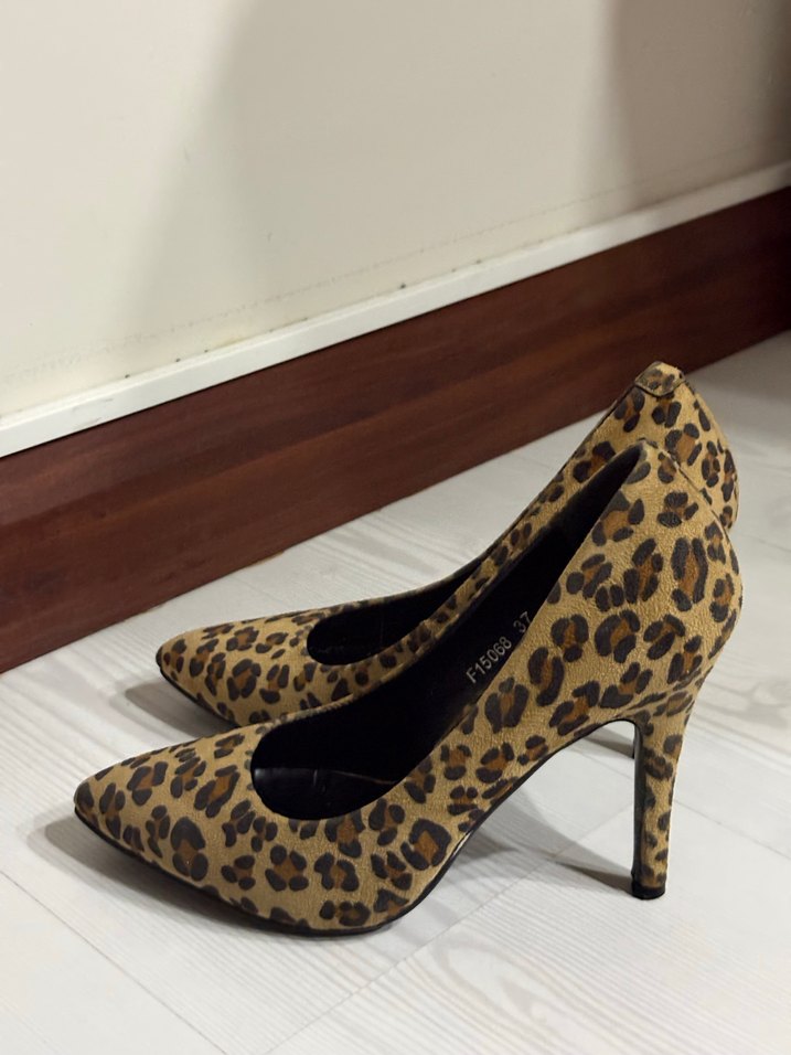 Kahverengi süet stilettolar, koyu leopar deseni ve kürk detaylarıyla cesur, çağdaş bir stile sahip, ofis için uygun.