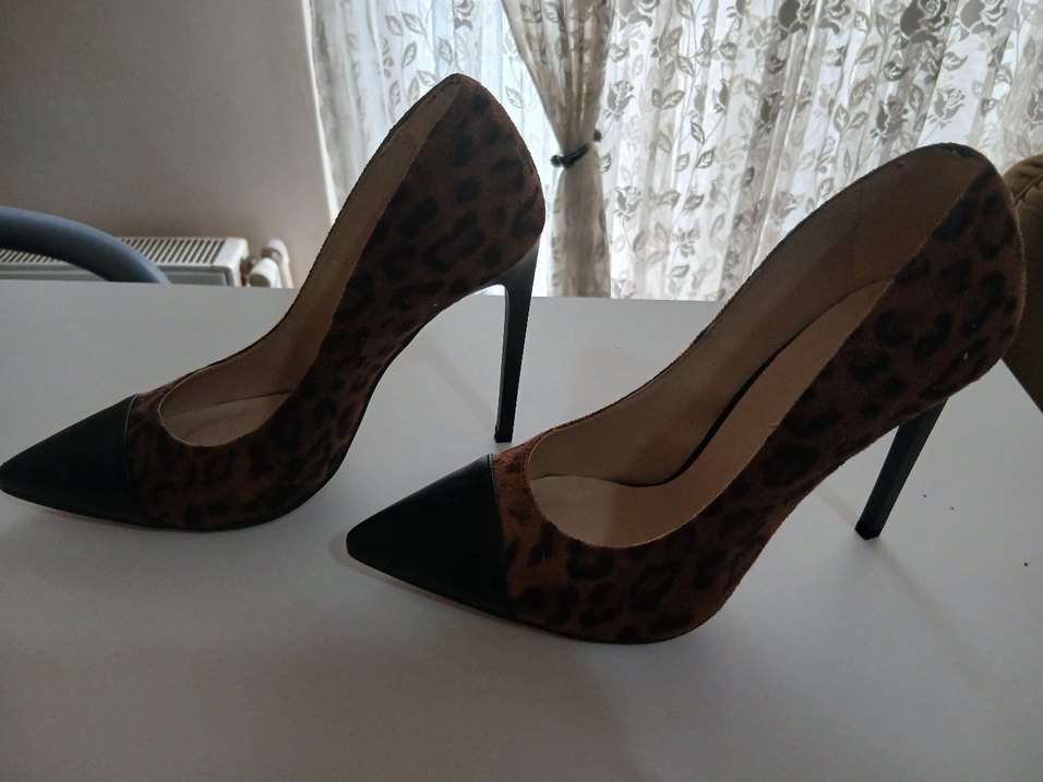 Kahverengi süet, leopar desenli ve kürk detaylı sivri burunlu stilettolar, ince topuklu, ofis ve sokak stili kullanımı için uygun.