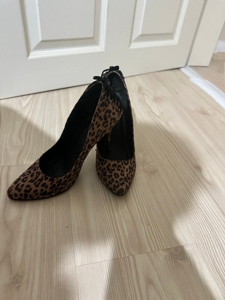 Kahverengi süet stilettolar, leopar desenli ve kürk detaylı, cesur ve çağdaş tarzı ile romantik akşamlar için uygun.