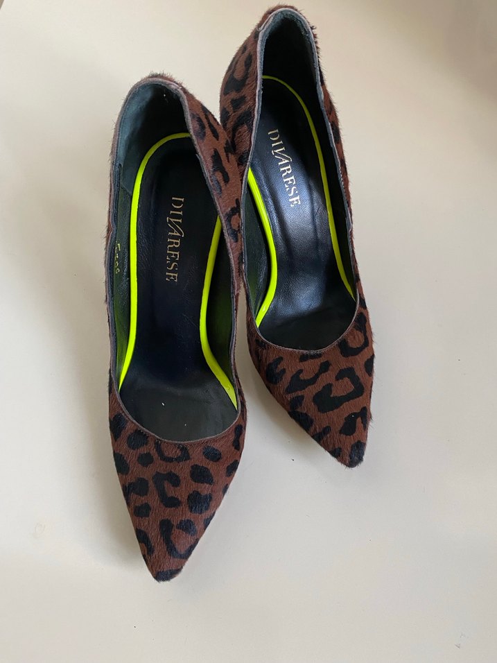 Kahverengi süet stilettolar, leopar desenli ve kürk detaylı, sivri burunlu ve yüksek topuklu, DIVARESE markası. Romantik gece için uygun.