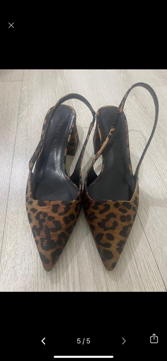 Kahverengi leopar desenli süet stilettolar, sivri burunlu ve tokalı arkası açık kayışlı, çağdaş Paris tarzını yansıtıyor.