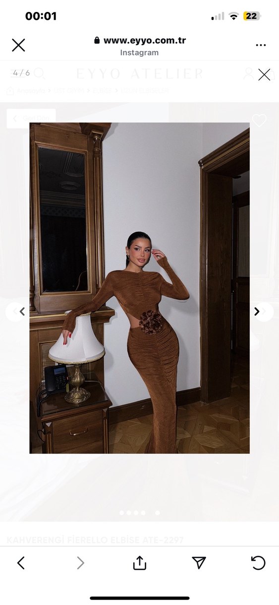 Kahverengi, süet kumaştan yapılmış, uzun kollu ve kemerli, leopar desenli, straplez uzun elbise. Romantik akşamlar için uygundur.