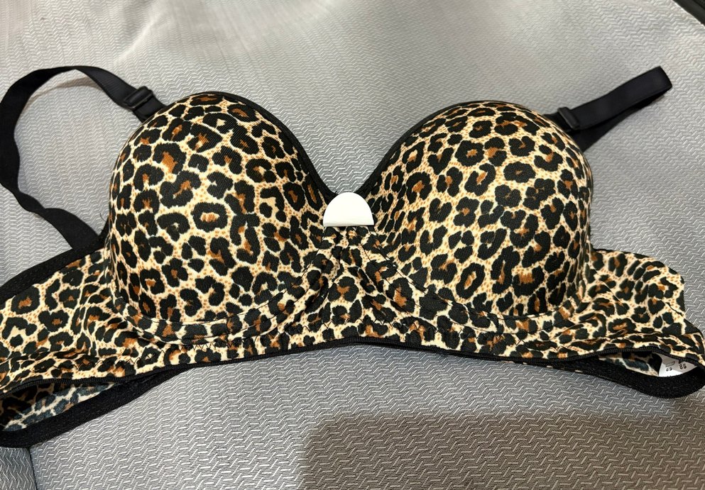 Koyu kahverengi leopar desenli, rahat bir sütyen. Desteksiz 85 beden Marka temsili