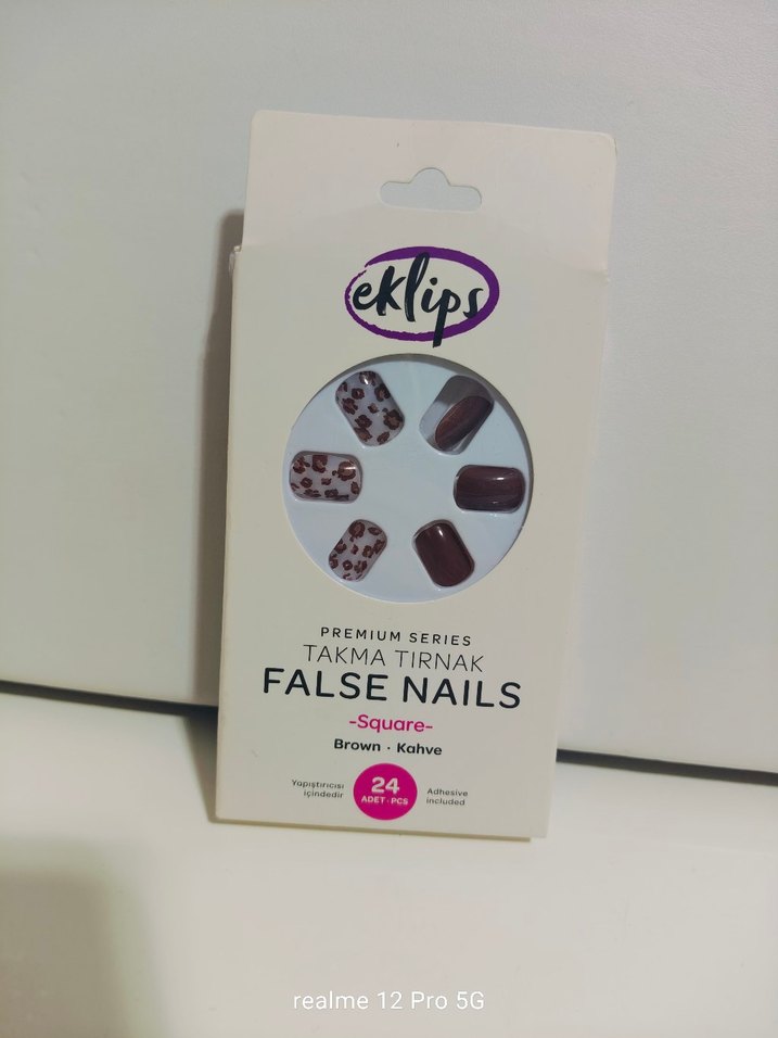 Kare şekilli, kahverengi leopar desenli ve bej tonlarında 24 adet takma tırnak. Yapıştırıcı dahildir.