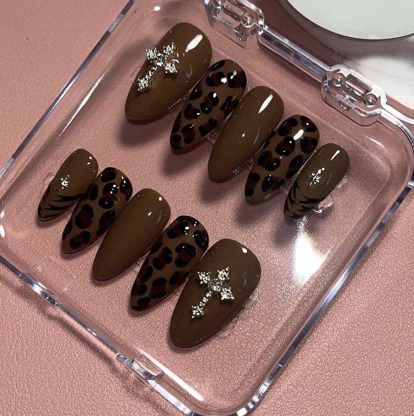 Koyu kahverengi zemin üzerine leopar desenli ve gümüş renkli haç süslemeli tırnak dekorları.