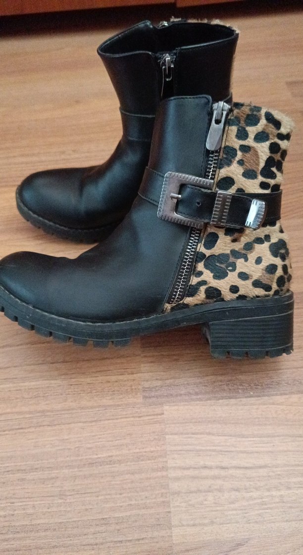 Koyu kahverengi deri, leopar desenli ve tokalı, blok topuklu biker bot, günlük kullanıma uygun. Marka temsilidir