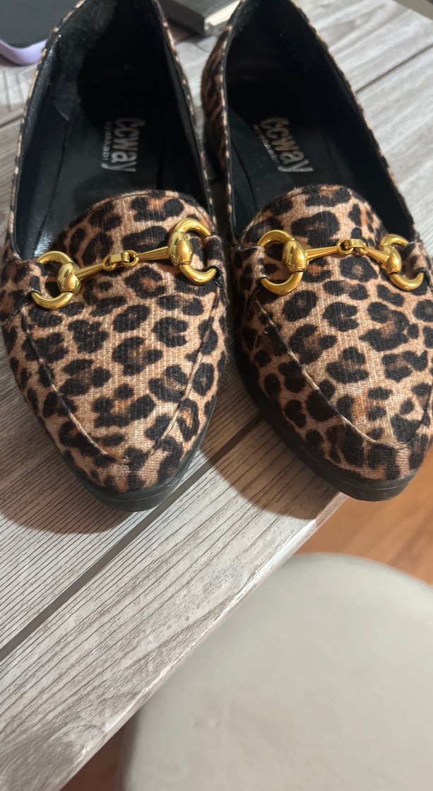 Kahverengi leopar desenli tokalı kadın loafer, kalın topuklu ve kauçuk tabanlı. Modern ve rahat tarzı bir araya getirir.