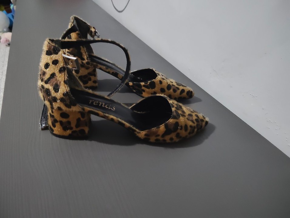 Kahverengi leopar desenli, tokalı ve blok topuklu kadın gece ayakkabıları, günlük kullanım için kauçuk malzemeden üretilmiştir.