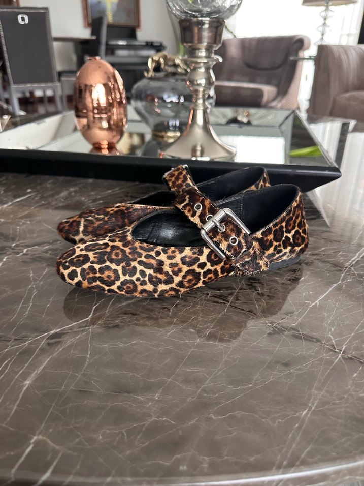 Kahverengi leopar desenli, tokalı ve yüksek topuklu kadın ayakkabısı. Kauçuk malzemeden üretilmiş, günlük sokak stili için uygundur.