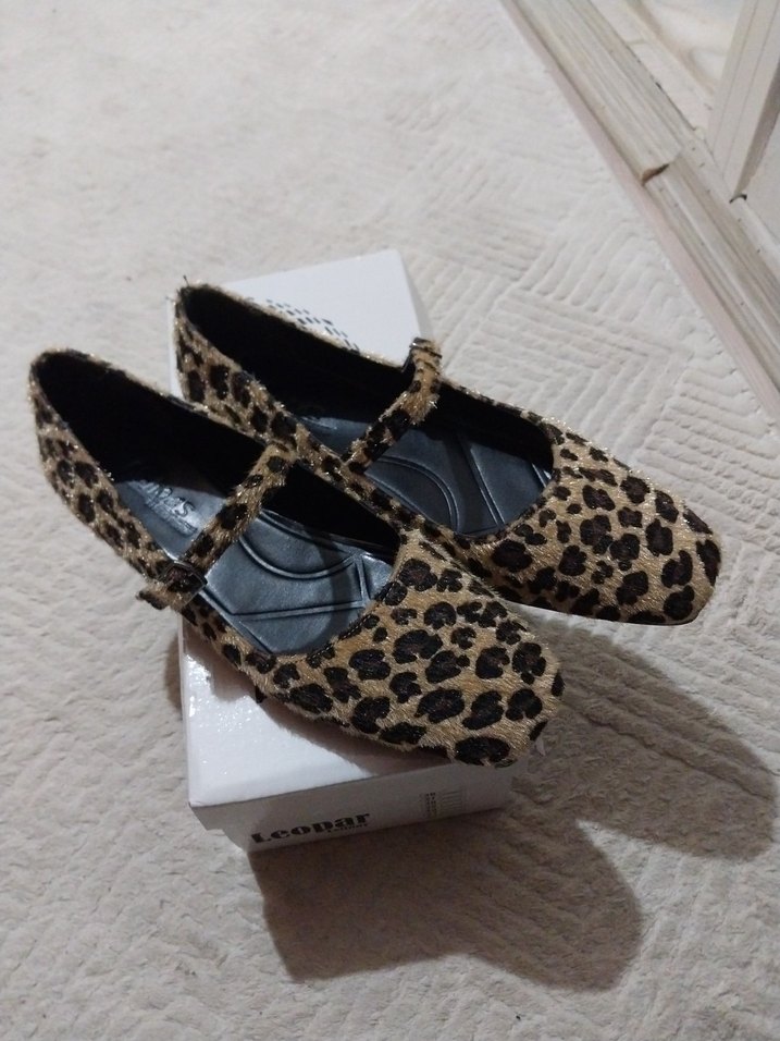 Kahverengi leopar desenli, tokalı ve topuklu kadın babetler, günlük kullanıma uygun şık sokak stili ayakkabılar.