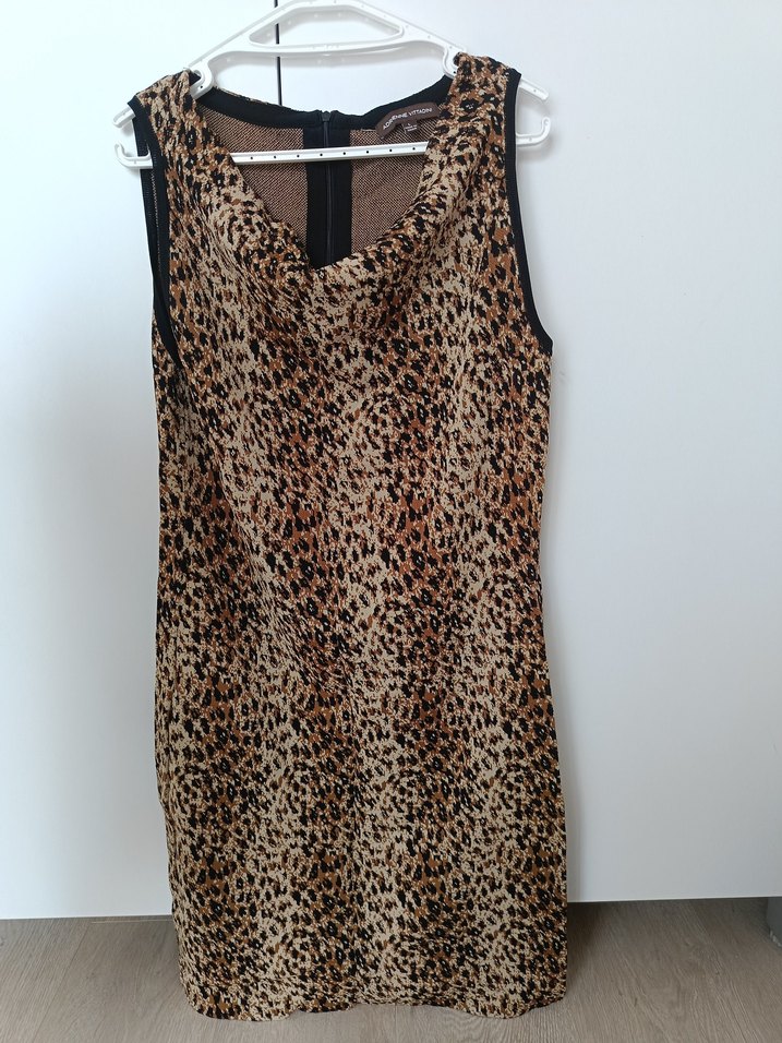 Kahverengi leopar desenli, kolsuz midi elbise. V yaka, vücuda oturan kesim ve triko kumaşı, rahat sokak stili için uygun.