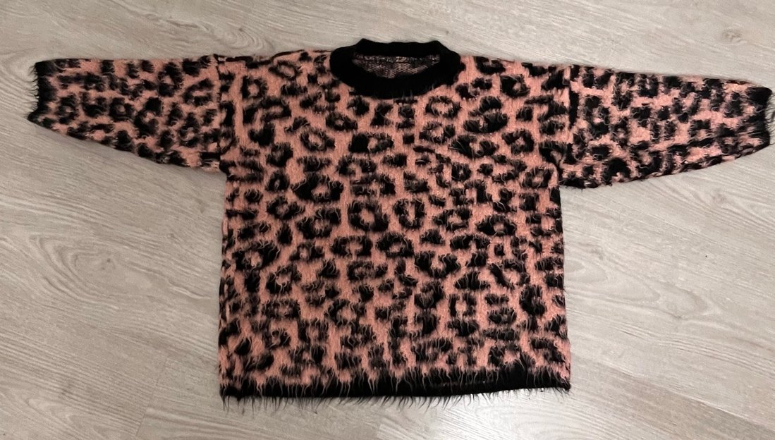 Kahverengi, tüylü leopar desenli triko kazak. Yarım kollu, yuvarlak yaka ve dar kesimdir. Bohem tarzı için uygundur.