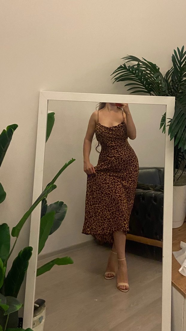 Kahverengi leopar desenli, ince askılı, V yaka ve drapeli tasarıma sahip, uzun ve vücuda oturan saten görünümlü elbise. Romantik akşamlar için uygun.
