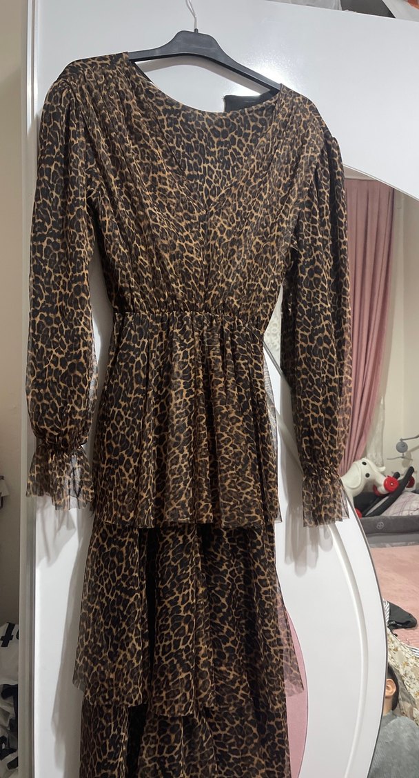 Kahverengi uzun elbise, leopar desenli ve bol kesimdir. V yaka, uzun kollu ve fırfırlı detaylara sahiptir. Bohem tarz için uygundur.