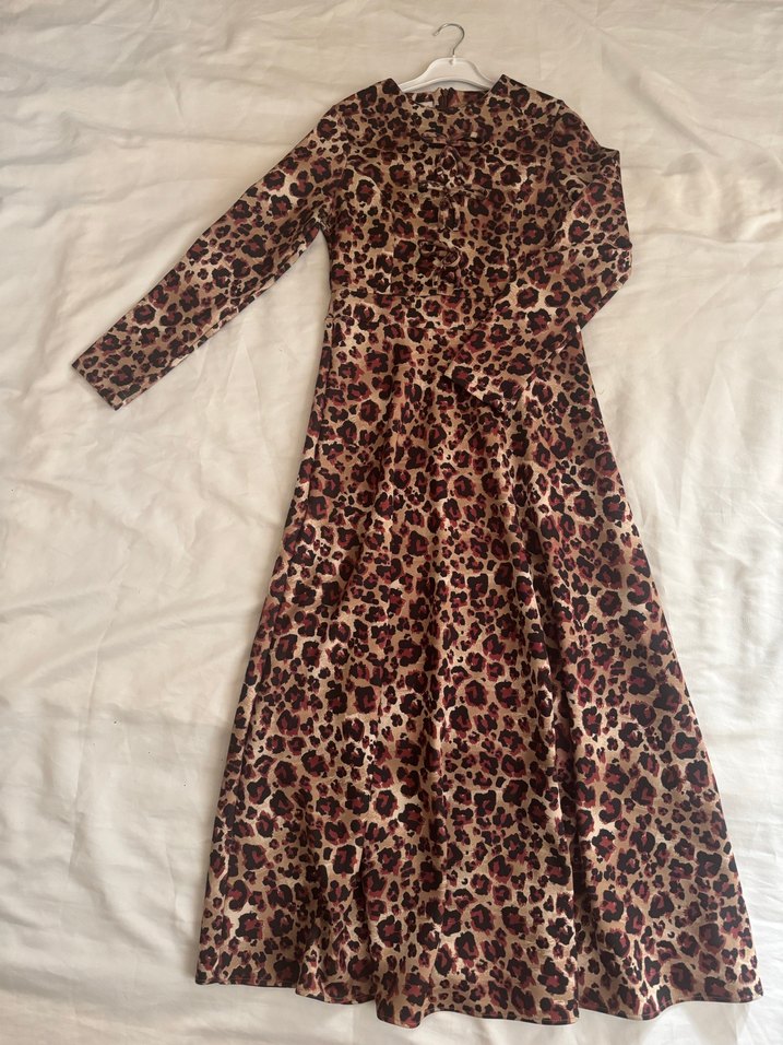 Kahverengi leopar desenli, uzun etek kısmı bol kesim pileli elbise. Uzun kollu, yüksek yakalı , vintage bohem tarzda fiyonk detaylı bir model. Bir kez doğum gününde giydim dolabımı yenileceğim için yarı fiyatına satıyorum, alıcısına hayırlı olsun