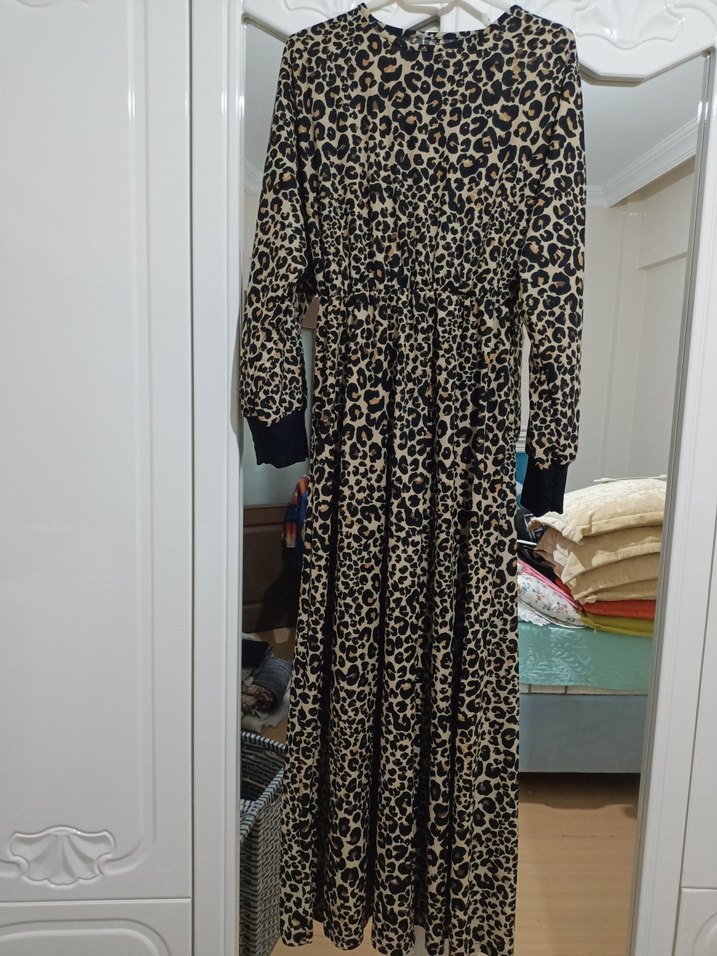Koyu kahverengi leopar desenli, pileli detaylı, uzun ve bol kesim elbise. Uzun kollu ve yuvarlak yakalı, bohem tarz için uygundur.
