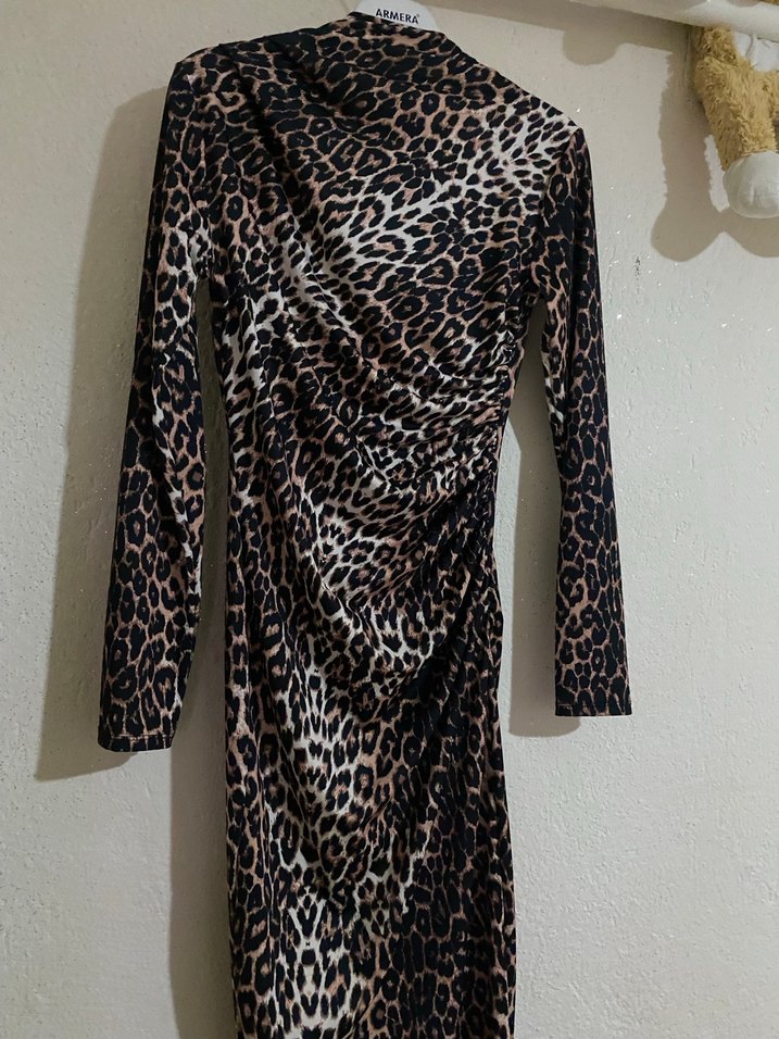 Kahverengi leopar desenli, yüksek yakalı ve uzun kollu bu dar kesim uzun elbise, yumuşak sentetik kumaştan drapeli tasarıma sahiptir.
