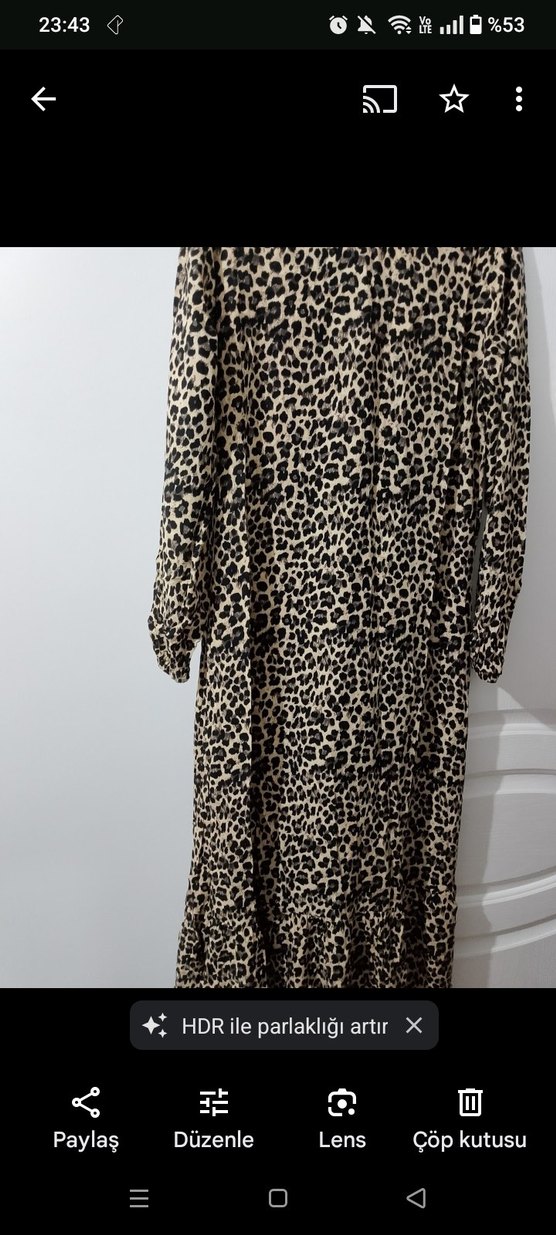 Kahverengi leopar desenli, uzun ve bol kesim elbise. Kürk detaylı, yüksek yakalı ve uzun kolludur. Yumuşak sentetik kumaştan, günlük kullanıma uygun bohem tarzda.