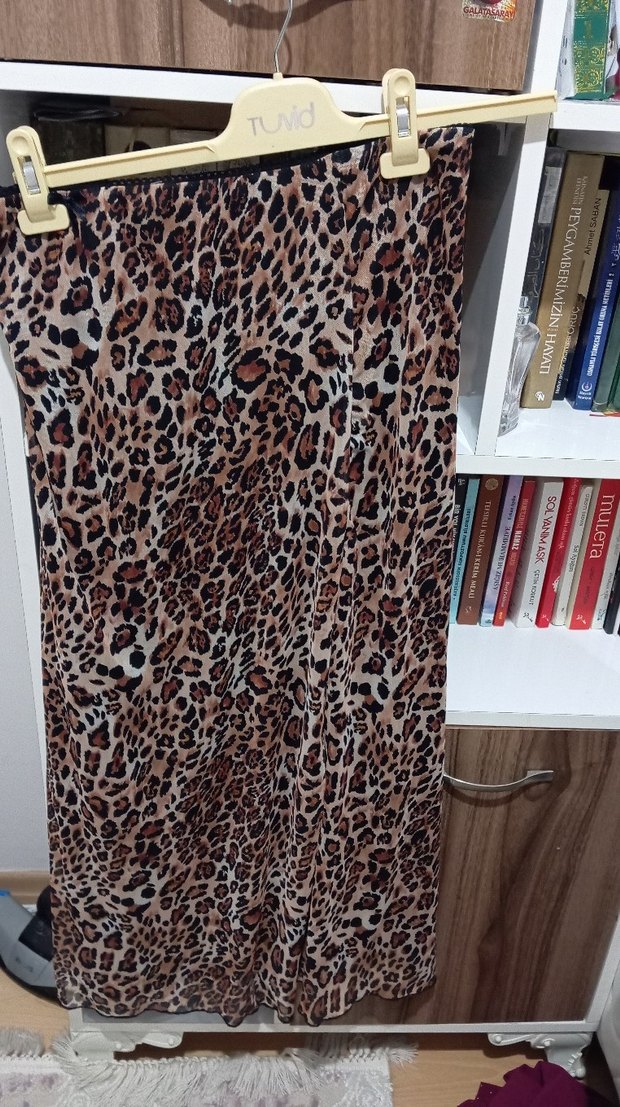 Koyu kahverengi leopar desenli, drapeli ve vücuda oturan uzun etek, yumuşak sentetik kumaştan. Bohem ve retro sokak stiline uygun.