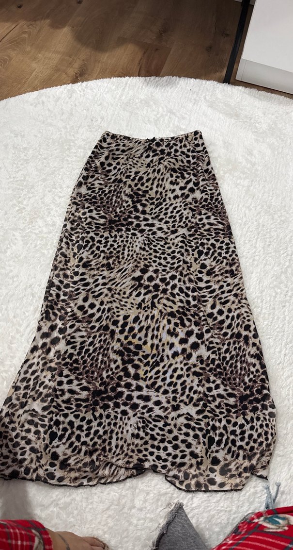 Kahverengi leopar desenli, uzun ve bol kesim etek, yumuşak sentetik kumaştan, bohem tarz için uygun, kürk detaylı.