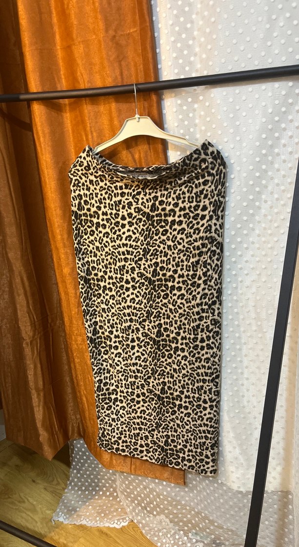 Kahverengi leopar desenli uzun etek, bol kesim ve kürk detaylı, yumuşak sentetik kumaştan üretilmiştir. Rahat ve bohem bir tarz sunar.