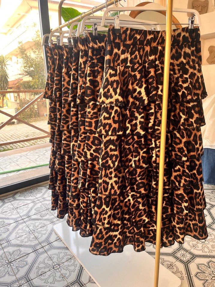 Sentetik kumaştan, kahverengi leopar desenli, bol kesim ve fırfırlı uzun etek. Bohem ve retro tarzlar için uygundur.