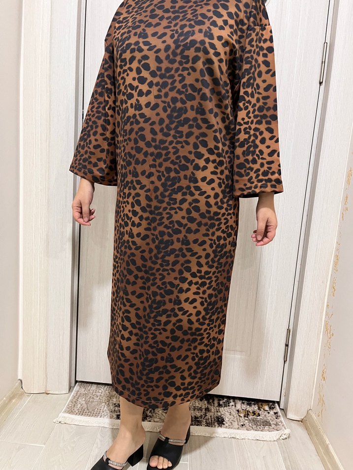 Kahverengi leopar desenli, bol kesim uzun elbise. Uzun kollu ve yuvarlak yakalı, yumuşak sentetik kumaştan, kürk detaylıdır.