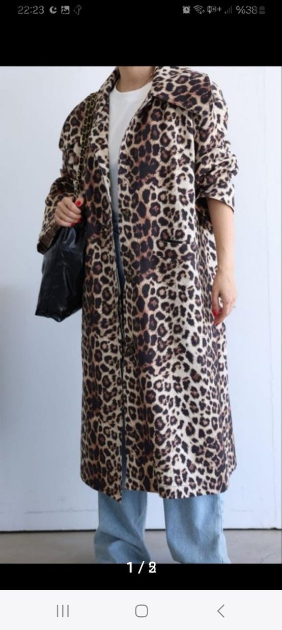 Kahverengi leopar desenli, uzun ve bol kesim kadın kaban. Uzun kollu, kürk detaylı ve kesimli yaka ile sokak stiline uygun.