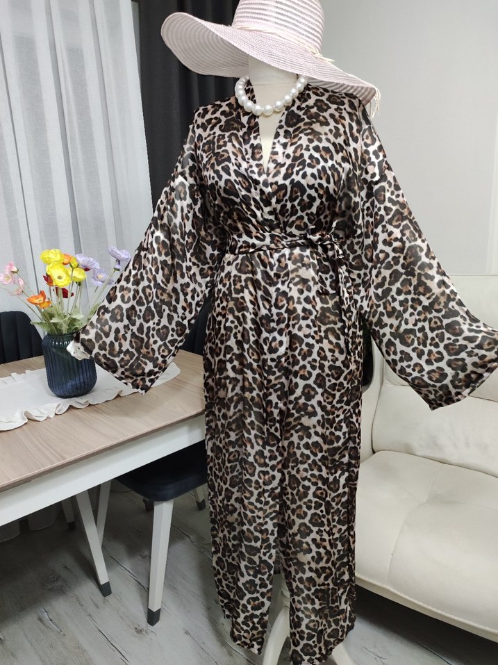 Kahverengi leopar desenli, uzun ve bol kesim kadın kimono. Uzun kollu ve V yaka, kemerli, yumuşak sentetik kumaştan, günlük kullanım için bohem tarzda. iç gösterir
