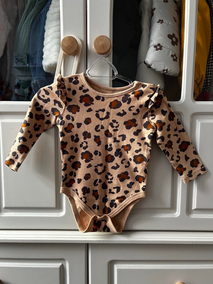 Koyu kahverengi, leopar desenli uzun kollu bebek body, yuvarlak yaka ve omuzlarda fırfır detaylıdır. 6-9 ay