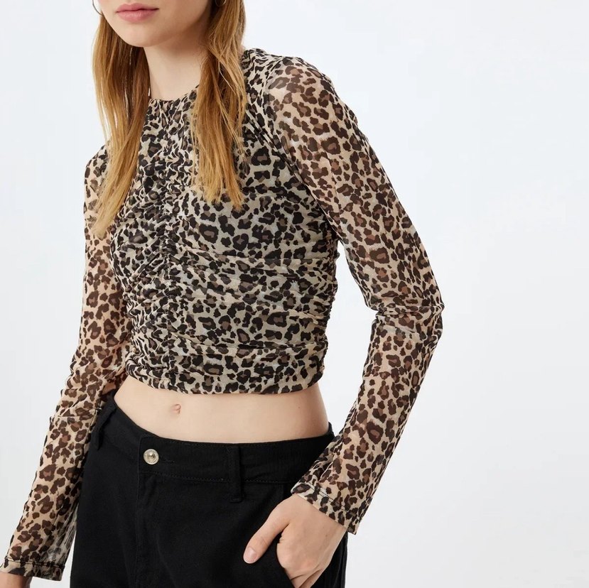 Dar kesim, kısa uzunlukta, yuvarlak yaka ve uzun kollu kahverengi leopar desenli, yumuşak sentetik kumaştan günlük kullanım için kürk detaylı bluz.