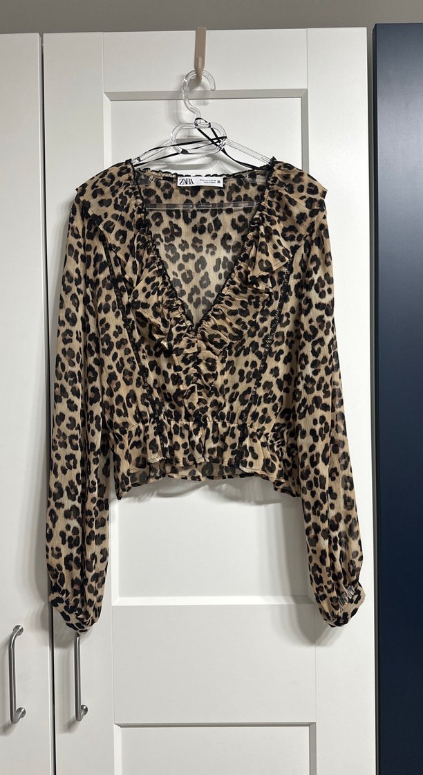 Kahverengi leopar desenli, uzun kollu, V yaka ve dantel detaylı bol kesim kısa uzunlukta bluz. Rahat ve günlük sokak stili için uygundur.