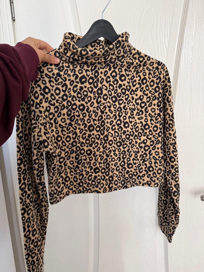 Bu kahverengi bluz, uzun kollu ve boğazlıdır. Leopar desenli, yumuşak ve tüylü detaylara sahip, rahat sokak stili için uygundur.