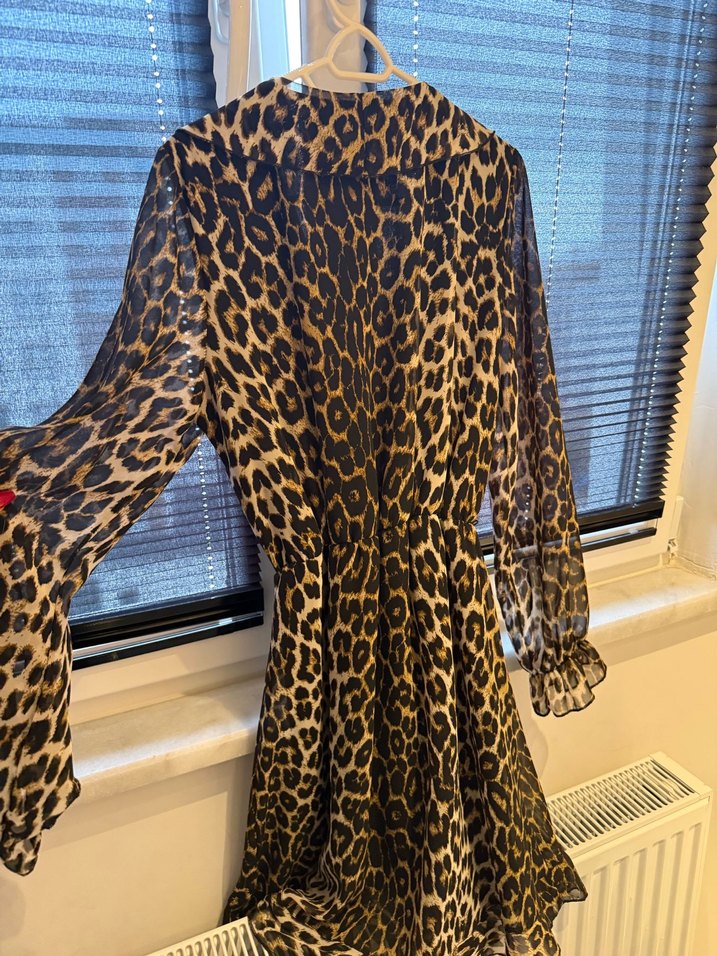 Kahverengi leopar desenli, uzun kollu ve V yakalı, kürk detaylı uzun elbise. Bohem ve retro Paris sokak tarzını yansıtır.
