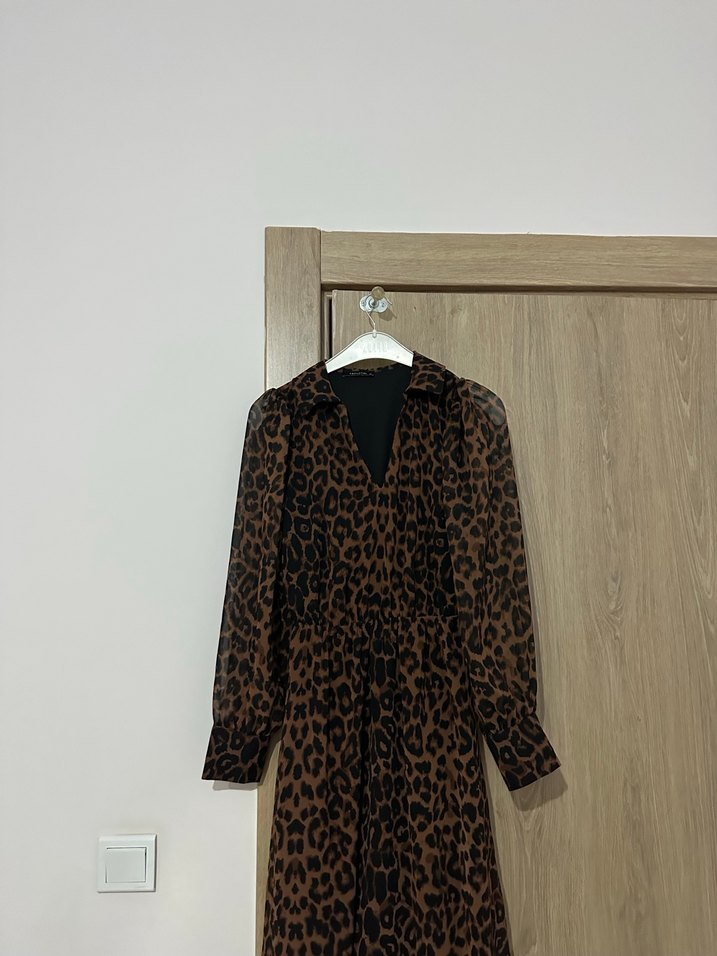 Kahverengi leopar desenli, uzun kollu ve V yakalı bu uzun elbise, rahat kesimi ve kemeriyle dikkat çeker. Yumuşak sentetik kumaştan üretilmiştir. Bilek üstü çizmeyle giyilebilir gözükmesi istenmiyorsa