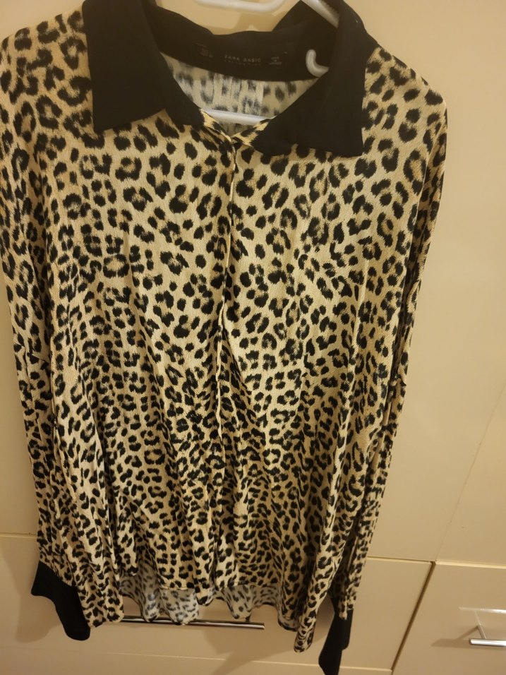 Kahverengi leopar desenli, yakalı ve uzun kollu, bol kesim gömlek. Yumuşak sentetik kumaştan, kürk detaylı, rahat sokak stili için uygun.