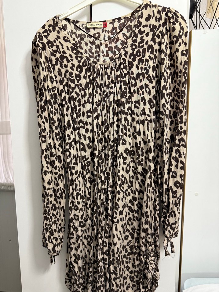 Kahverengi, leopar desenli uzun kollu kadın tunik. V yaka, bol kesim ve kürk detaylı, sentetik kumaştan üretilmiştir. Günlük kullanım için uygundur.