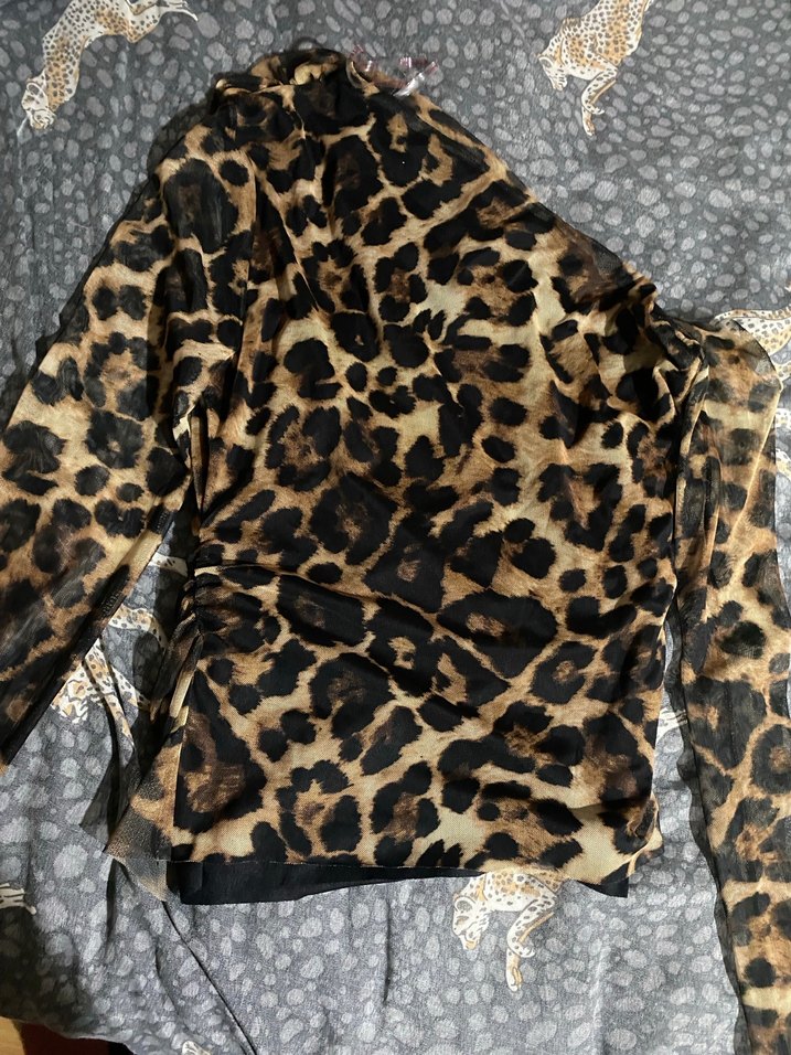 Kahverengi leopar desenli, uzun kollu ve balıkçı yaka detaylı, yumuşak sentetik kumaştan, vücuda oturan uzun tül bluz. Sokak stili için uygun.