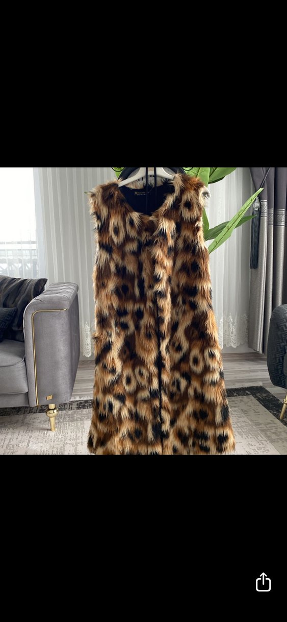 Kahverengi leopar desenli, peluş detaylı uzun yelek. Kolsuz, straplez yakalı ve bol kesimdir. Yumuşak sentetik kumaştan, bohem tarz için uygun. Şık duruyor